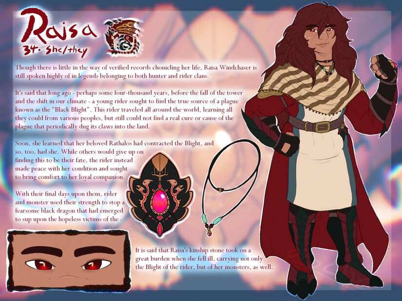 Though there is little in the way of verified records chronicling her life, Raisa Windchaser is still spoken highly of in legends belonging to both hunter and rider clans.It's said that long ago - perhaps some four-thousand years, before the fall of the tower and the shift in our climate - a young rider sought to find the true source of a plague known as the "Black Blight". This rider traveled all around the world, learning all they could from various peoples, but still could not find a real cure or cause of the plague that periodically dug its claws into the land.Soon, she learned that her beloved Rathalos had contracted the Blight, and so, too, had she. While others would give up on finding this to be their fate, the rider instead made peace with her condition and sought to bring comfort to her loyal companion.With their final days upon them, rider and monster used their strength to stop a fearsome black dragon that had emerged to sup upon the hopeless victims of the -(The entry ends here.)Note: It is said that Raisa's kinship stone took on a great burden when she fell ill, carrying not only the Blight of the rider, but of her monsters, as well.