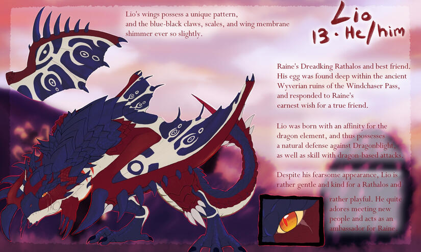 Raine's Dreadking Rathalos and best friend. His egg was found deep within the ancient Wyverian ruins of the Windchaser Pass, and responded to Raine's earnest wish for a true friend.Lio was born with an affinity for the dragon element, and thus possesses a natural defense against Dragonblight as well as skill with dragon-based attacks.Despite his fearsome appearance, Lio is rather gentle and kind for a Rathalos and rather playful. He quite adores meeting new people and acts as an ambassador for Raine.Note: Lio's wings possess a unique pattern, and the blue-black claws, scales, and wing membrane shimmer ever so slightly.