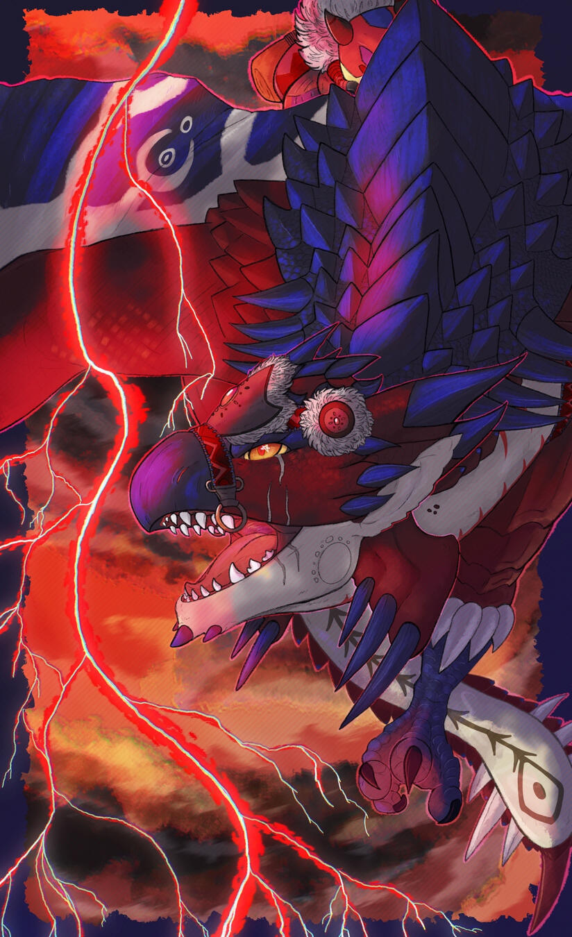 Raine's Dreadking Rathalos and best friend. His egg was found deep within the ancient Wyverian ruins of the Windchaser Pass, and responded to Raine's earnest wish for a true friend.Lio was born with an affinity for the dragon element, and thus possesses a natural defense against Dragonblight as well as skill with dragon-based attacks.Despite his fearsome appearance, Lio is rather gentle and kind for a Rathalos and rather playful. He quite adores meeting new people and acts as an ambassador for Raine.Note: Lio's wings possess a unique pattern, and the blue-black claws, scales, and wing membrane shimmer ever so slightly.