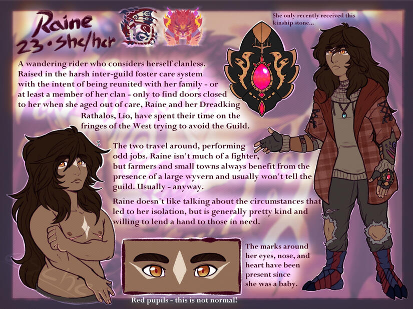 A wandering rider who considers herself clanless.Raised in the harsh inter-guild foster care system with the intent of being reunited with her family - or at least a member of her clan - only to find doors closed to her when she aged out of care, Raine and her Dreadking Rathalos, Lio, have spent their time on the fringes of the West trying to avoid the Guild.The two travel around, performing odd jobs. Raine isn't much of a fighter, but farmers and small towns always benefit from the presence of a large wyvern and usually won't tell the guild. Usually - anyway.Raine doesn't like talking about the circumstances that led to her isolation, but is generally pretty kind and willing to lend a hand to those in need.Note I: She only recently received this kinship stone...
